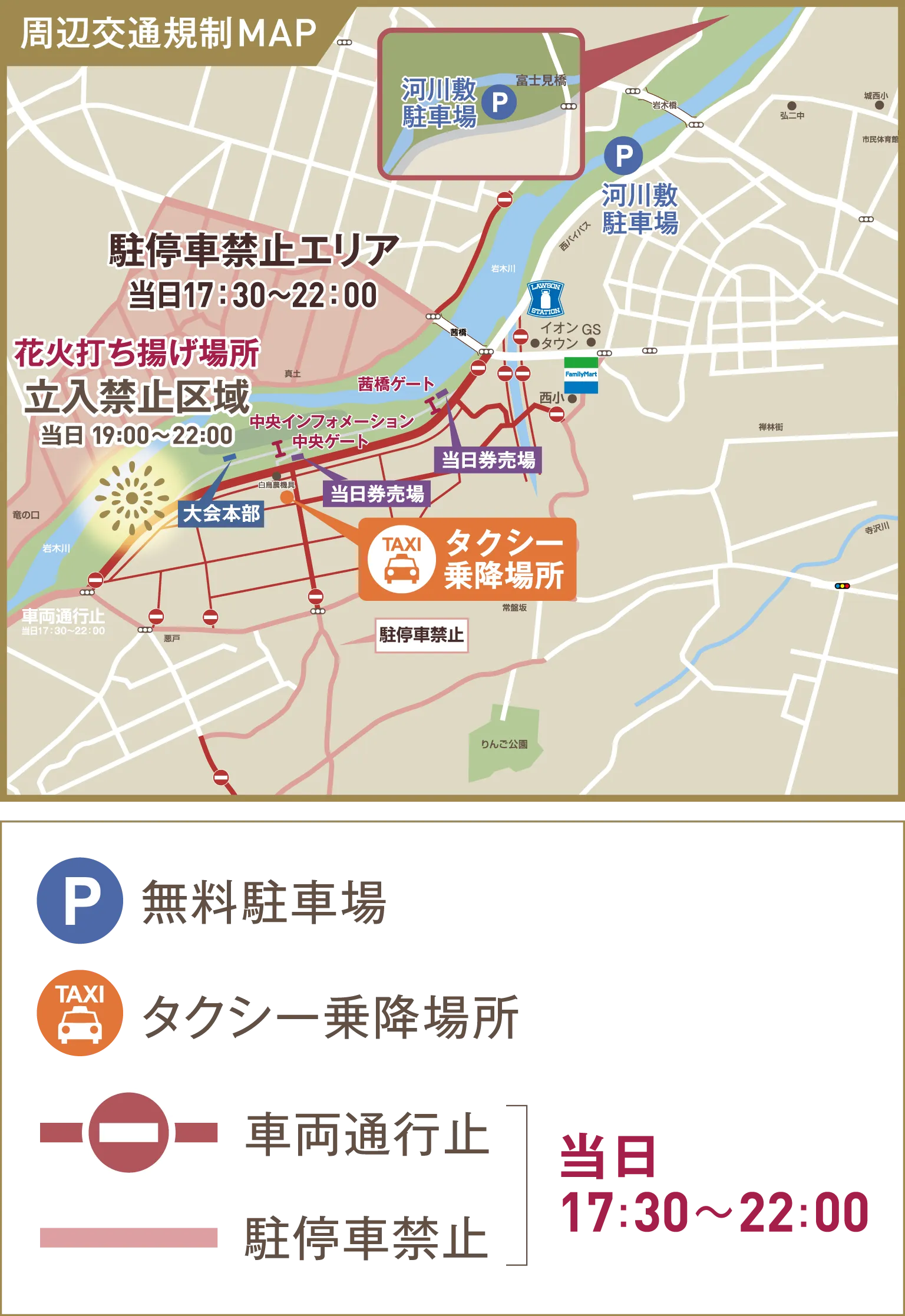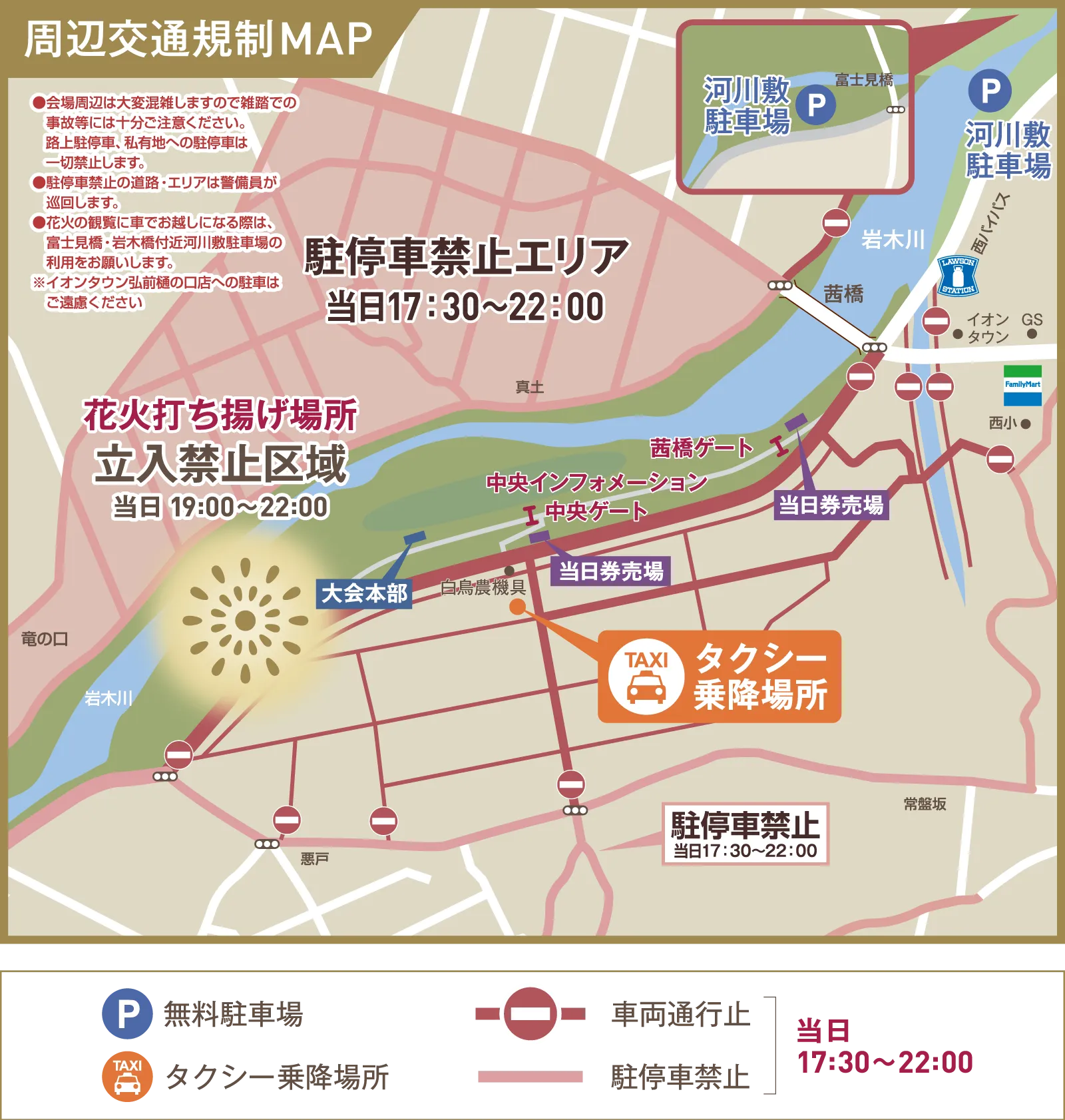 ●花火の観覧に車でお越しになる際は、富士見橋・岩木橋付近河川敷駐車場の利用をお願いします。